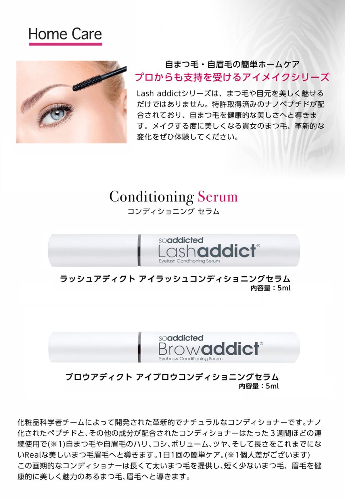 ナノ化されたペプチドと!まつげの育毛に効果的に作用する成分が配合さへたコンディショニングは、たった3週間ほどの連続使用(個人差があります)で、自まつ毛のはり、コシ、ボリューム、ツヤ、そして長さを、これまでにないリアルな美しいまつ毛と導きます。